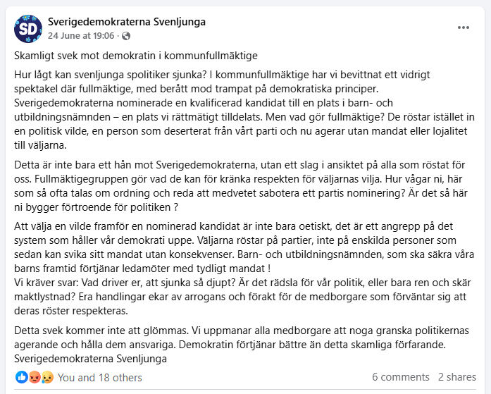 Sverigedemokraterna nominerade en kvalificerad kandidat till en plats i barn- och utbildningsnämnden – en plats vi rättmätigt tilldelats. Men vad gör majoriteten? De röstar istället in en politisk vilde, en person som deserterat från vårt parti och nu agerar utan mandat eller lojalitet till väljarna. Detta är inte bara ett hån mot Sverigedemokraterna, utan ett slag i ansiktet på alla som röstat för oss.