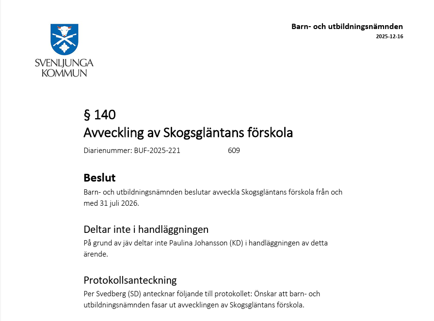 - Protokoll från Kommunfullmäktiges sammanträde den 18 december 2025 - § 132 Beslut: Svenljungaförslaget (Medborgarförslag), ”Lägg inte ner Skogsgläntans förskola”, remmiteras till Barn- och utbildningsnämnden för beredning och beslut.