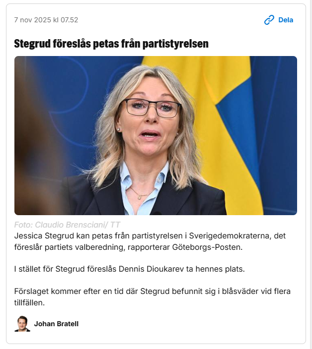 Senast i raden är nu Jessica Stegrud. Hon är extremt kunnig i energifrågor. För ett halvår sedan plockades hon bort från Näringsutskottet och blev ordförande i Socialutskottet. Vill SD inte ta till vara på hennes kapacitet? Och nu håller hon på att försvinna.