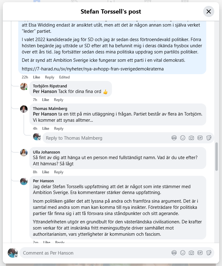 Jag vet redan ett beslut som Ambition Sverige har fattat som strider mot god föreningssed och som partiet hade blivit fällt för i en tingsrätt. Det gäller hur man beslutade om medlemsavgiften. En person ändrade utan att fråga någon annan ett tidigare protokollfört beslut som hade skickats till Skatteverket och Valmyndigheten. Anledningen till ändringen var att ingen visste vad god föreningssed betyder.
